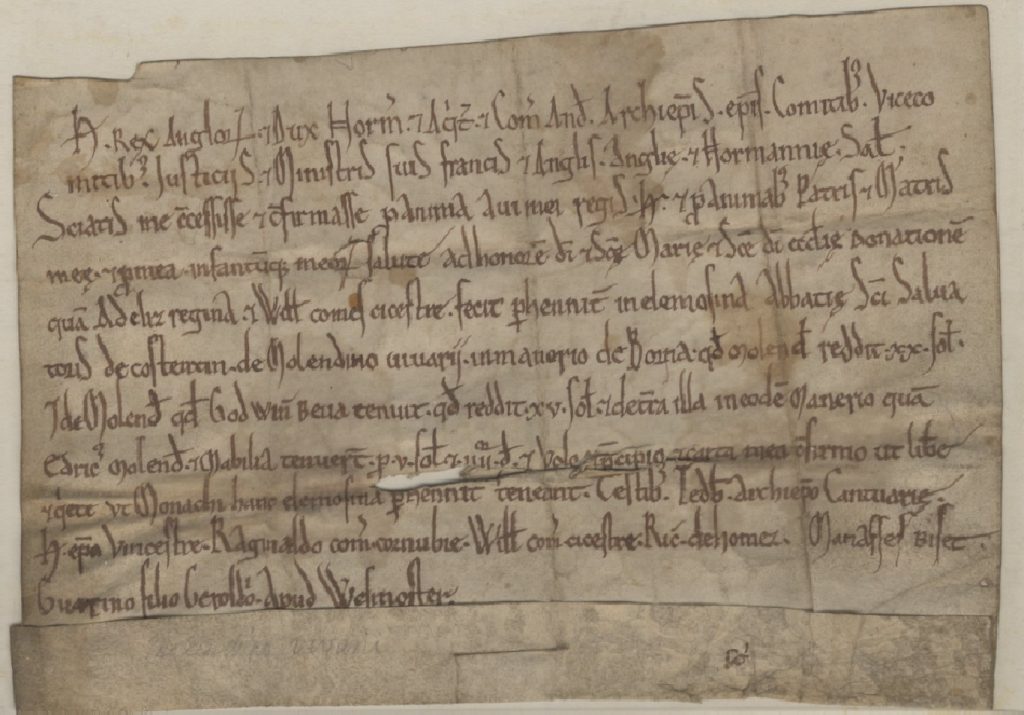 The charter tells us that Henry II gave two mills and some land in England to the Abbey of St. Sauveur-le-Vicomte in Normandy. He did this to honour the memories of his parents, Geoffrey of Plantagent and the Empress Matilda, and his grandfather, Henry I.