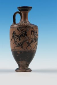 The Amazons fighting Greeks on this lekythos, or oil jar, represent a tribe of female warriors endowed with skill and bravery typically assigned to male Greek warriors. The light-haired man at the centre might be the Greek hero Achilles, shown at the moment he fell in love with the Amazon queen Penthesilea, sadly when he stabbed and killed her. There has been a sense of otherness regarding Amazons, due to their reclusive customs and lifestyles: they lived away from the society of men. Ancient Greeks cast Amazons as foreigners from the East and referred to them with the term barbarian which means ‘people who don’t speak Greek’. Their otherness pits them against Greek men and women alike. Archaeological finds indicate that these mythical women were based on warrior women from central Asia, where men and women were treated with greater equality than in Greece and where women became respected warriors. Women embodying male values challenged the ancient Greeks’ gender constructions. Clearly the Greeks feared women who could hold their own against men. In the 1970s, therefore, lesbians adopted aspects of Amazon identity such as motif of the labrys or double-axe, one of their usual weapons.